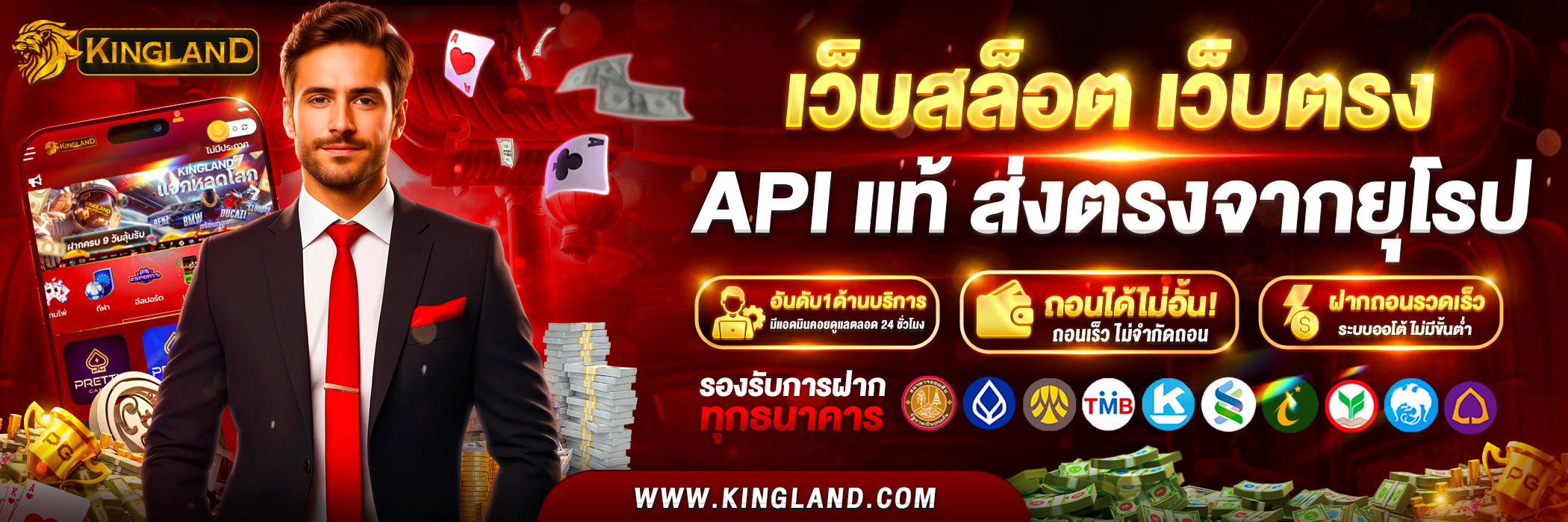 ระบบฝาก-ถอนของ KINGLAND ทำงานตลอด 24 ชั่วโมง ไม่มีวันหยุด ทำให้สมาชิกสามารถทำรายการได้ทุกเมื่อที่ต้องการ โดยใช้เวลาในการดำเนินการเพียง 30 วินาทีเท่านั้น นอกจากนี้ ยังรองรับการทำธุรกรรมผ่านธนาคารชั้นนำทุกแห่งในประเทศไทย รวมถึงช่องทาง e-wallet ยอดนิยมอย่าง True Money Wallet