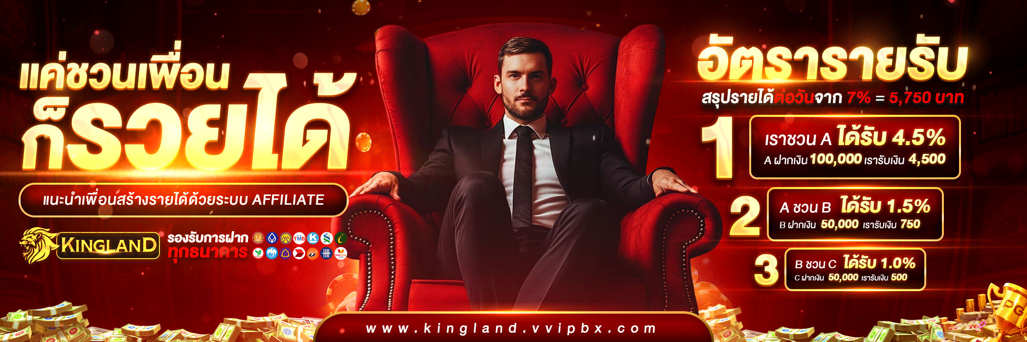 สมาชิก KINGLAND ยังได้รับสิทธิพิเศษในการเข้าร่วมโปรแกรม VIP ที่มอบสิทธิประโยชน์มากมาย เช่น อัตราการจ่ายที่สูงขึ้น โบนัสพิเศษในวันเกิด และผู้ดูแลบัญชีส่วนตัว ยิ่งเล่นมากยิ่งได้รับสิทธิประโยชน์มากขึ้น ระบบสะสมแต้มของเรายังช่วยให้สมาชิกสามารถแลกรับของรางวัลมูลค่าสูงได้อีกด้วย